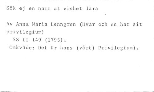 Sök ej en narr at vishet lära //// Av Anna Maria Lenngren (livar och en har sit privilegium) //// SS II 149 (1795). //// Omkväde: Det är hans (värt) Privilegium).