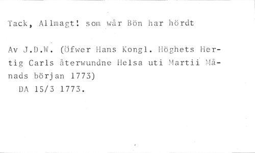 Tack, Allmagt! som wår Bön har hördt //// Av J.D.W. (öfwer Hans Kongl. Höghets Hertig Carls återwundne Helsa uti Martii Månads början 1773) //// DA 15/3 1773.