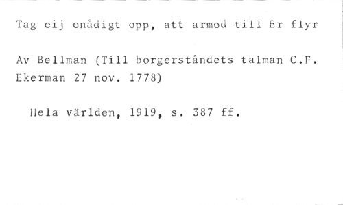 Tag eij onådigt opp, att armod till Er flyr //// Av Bellman (Till borgerståndets talman C.F. Ekerman 27 nov. 1778) //// Hela världen, 1919, s. 387 ff.