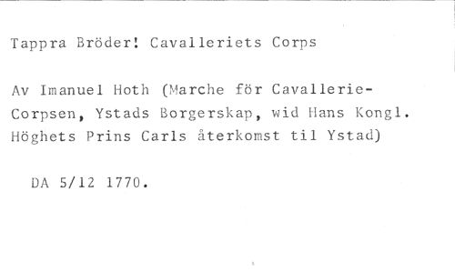 Tappra Bröder: Cavalleriets Corns //// Av Imanuel Hoth (Marche för CavallerieCorpsen, Ystads Borgerskap, wid Hans Kongi. Höghets Prins Carls återkomst til Ystad) //// DA 5/12 1770.