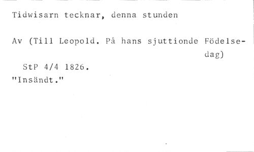 Tidwisarn tecknar, denna stunden //// Av (Till Leopold. På hans sjuttionde Födelse- //// dag) //// StP 4/4 1826. //// "Insändt."