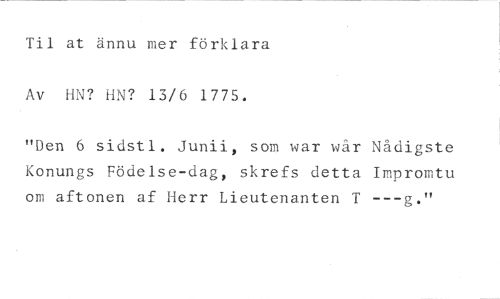 Til at ännu mer förklara Av HN? DN? 13/6 1775. //// "Den 6 sidstl. Junii, som war war Nådigste Konungs Födelse-dag, skrefs detta Impromtu om aftonen af Herr Lieutenanten T ---g."