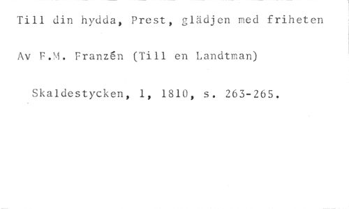 Till din hydda, Prest, glädjen med friheten Av F.M. Franz6n (Till en Landtman) //// Skaldestycken, 1, 1810, s. 263-265.