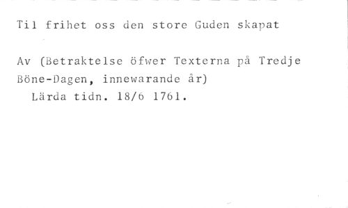 Til frihet oss den store Guden skapat //// Av (Betraktelse öfwer Texterna på Tredje Böne-Dagen, innewarande år) Lärda tidn. 18/6 1761.