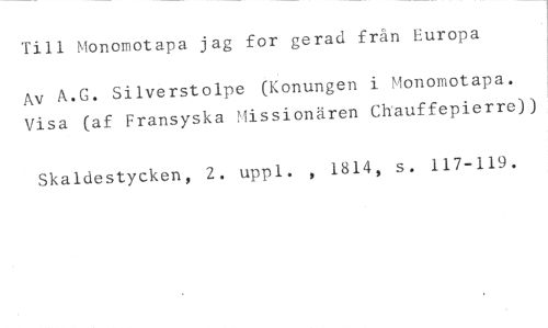 Till Monomotapa jag for gerad frän Europa //// Av A.G. Silverstolpe (Konungen i Monomotapa. Visa (af Fransyska Missionären Chauffepierre)) //// Skaldestycken, 2. uppl. , 1814, s. 117-119.