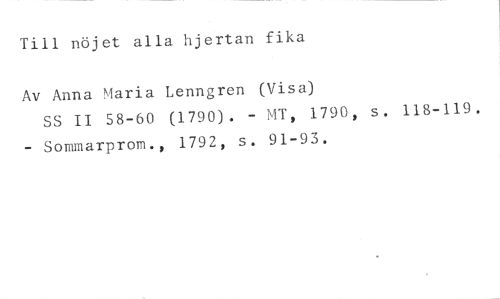 Till nöjet alla hjertan fika //// Av Anna Maria Lenngren (Visa) //// SS II 58-60 (1790). - MT, 1790, s. 118-119. - Sommarprom., 1792, s. 91-93.