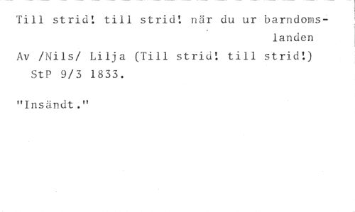 Till strid, till strid: när du ur barndoms- //// landen //// Av /Nils/ Lilja (Till strid! till strid!) StP 9/3 1833. //// "Insändt."