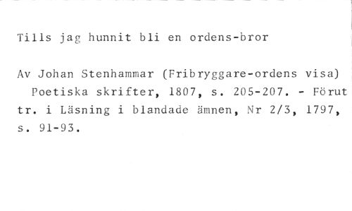 Tills jag hunnit bli en ordens-bror //// Av Johan Stenhammar (Fribryggare-ordens visa) Poetiska skrifter, 1807, s. 205-207. - Förut tr. i Läsning i blandade ämnen, Nr 2/3, 1797, s. 91-93.