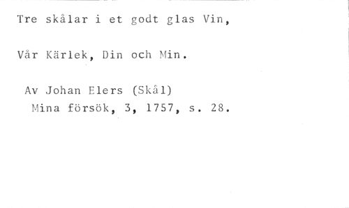 Tre skålar i et godt glas Vin, Vår Kärlek, Din och Min. //// Av Johan Elers (Skål) //// Mina försök, 3, 1757, s. 28.