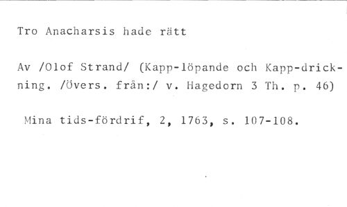 Tro Anacharsis hade rätt //// Av /Olof Strand/ (Kapp-löpande och Kapp-drickning. /Övers. från:/ v. Hagedorn 3 Th. p. 46) //// Mina tids-fördrif, 2, 1763, s. 107-108.