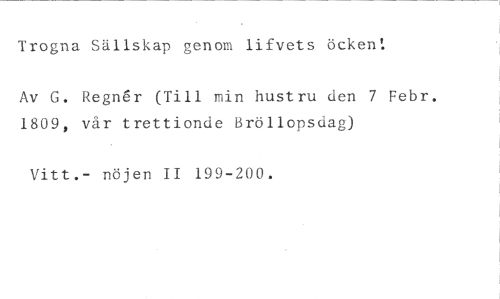 Trogna Sällskap genom lifvets öckent //// Av G. Regnar (Till min hustru den 7 Febr. 1809, vår trettionde Bröllopsdag) //// Vitt.- nöjen II 199-200.