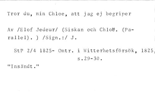 Tror du, min Chloe, att jag ej begriper //// Av /Elof Jedeur/ (Siskan och Chloe. (Paralle1). ) /Sign.:/ J. //// StP 2/4 1825- Omtr. i Witterhetsförsök, 1825, //// s.29-30. //// "Insändt."