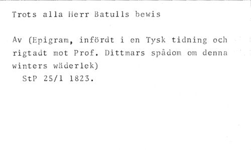 Trots alla herr fatulls bewis //// Av (Epigram, infördt i en Tysk tidning och rigtadt mot Prof. Dittmars spådom om denna winters wäderlek) //// StP 25/1 1823.