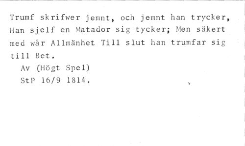 Trumf skrifwer jemnt, och jemnt han trycker, Han sjelf en Matador sig tycker; Men säkert med wär Allmänhet Till slut han trumfar sig till Bet. //// Av (Högt Spel) //// StP 16/9 1814.