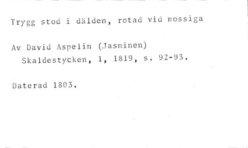 Trygg stod i dälden, rotad vid mossiga //// Av David Aspelin (Jasminen) //// Skaldestycken, 1, 1819, S. 92-93. //// Daterad 1803.