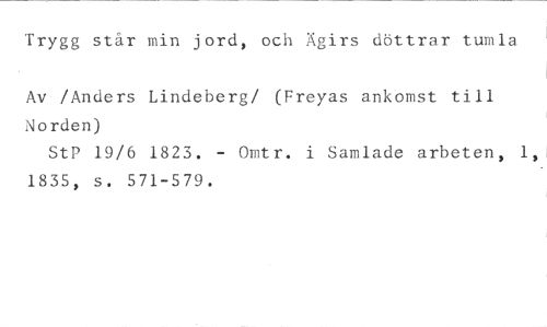 Trygg står min jord, och Ägirs döttrar tumla //// Av /Anders Lindeberg/ (Freyas ankomst till Norden) //// StP 19/6 1823. - Omtr. i Samlade arbeten, 1,, 1835, s. 571-579.