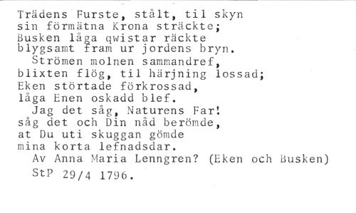 Trädens Furste, stålt, til skyn //// sin förmätna Krona sträckte; //// Busken låga ciwistar räckte //// blygsamt fram ur jordens bryn. //// Strömen molnen sammandref, //// blixten flög, til härjning lossad; //// Eken störtade förkrossad, //// låga Enen oskadd blef. //// Jag det såg, Naturens Far: //// såg det och Din nåd berömde, //// at Du uti skuggan gömde //// mina korta lefnadsdar. //// Av Anna Maria Lenngren? (Eken och Busken) //// StP 29/4 1796.