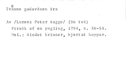 e //// Tvänne gudaväsen ära //// Av /Lorenz Peter Bagge/ (De två) //// Försök af en yngling, 1794, s. 56-58. Mel.: Blodet brinner, hjertat hoppar.