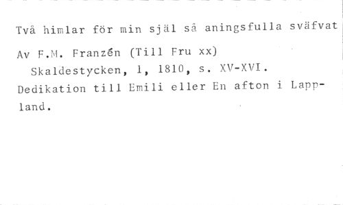 Två hiirlar för min själ så aningsfulla sväfvat //// Av F.M. Franzén (Till Fru xx) //// Skaldestycken, 1, 1810, s. XV-XVI. //// Dedikation till Emili eller En afton i Lappland.