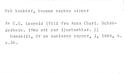 Två knekter, tvenne vackra nipper //// Av C.G. Leopold (Till fru Anna Charl. Schröderheim. (Med ett par ljusknektar. )) Hanselli, Ur en samlares papper, 1, 1868, s. s.36.