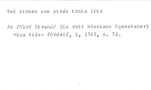 Twå sinnen som städs tänka lika //// Av /Olof Strand/ (En rätt Wänskaps Egenskaper) Mina tids- fördrif, 1, 1763, s. 71.