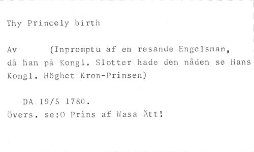 Thy Princely birth //// Av (Inpromptu af en resande Engelsman, //// då han på Kongl. Slotter hade den nåden se Hans Kongl. Höghet Kron-Prinsen) //// DA 19/5 1780. //// Övers. se:O Prins af Wasa Ätt!