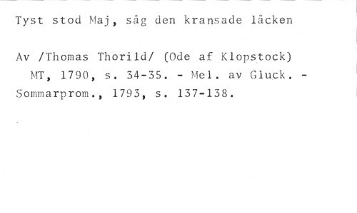 Tyst stod Maj, såg den kransade låcken //// Av /Thomas Thorild/ (Ode af Klopstock) MT, 1790, s. 34-35. - Mel. av Gluck. - Sommarprom., 1793, s. 137-138.