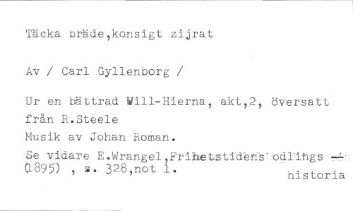 Täcka bräde,konsigt zijrat Av / Carl Gyllenborg //// /Ur en bättrad Wi11-Hierna, akt,2, översatt från R.Steele //// Musik av Johan Roman. //// Se vidare E.Wrangel,Fritietstidthb'odlifig. //// 0.895) , s. 328,not 1. //// historia
