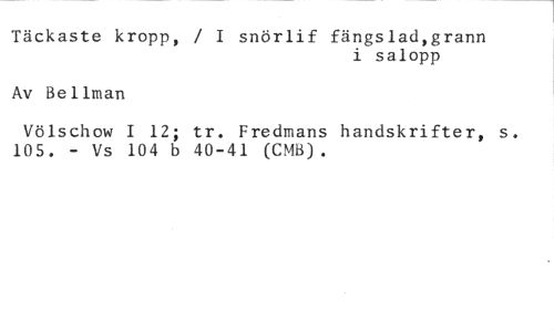 Täckaste kropp, / I snörlif fängslad,grann //// i salopp //// Av Bellman //// Völschow I 12; tr. Fredmans handskrifter, s. 105. - Vs 104 b 40-41 (CMB).