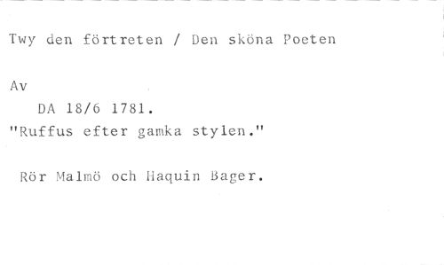Twy den förtreten / Den sköna Poeten //// Av //// DA 18/6 1781. //// "Ruffus efter gamka stylen." //// Rör Malmö och Haquin Bager.
