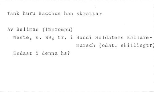 Tänk huru Bacchus han skrattar //// Av Bellman (Imprompu) //// Weste, s. 89; tr. i Bacci Soldaters Källare- //// marsch (odat. skillingtr) //// Endast i denna hs?