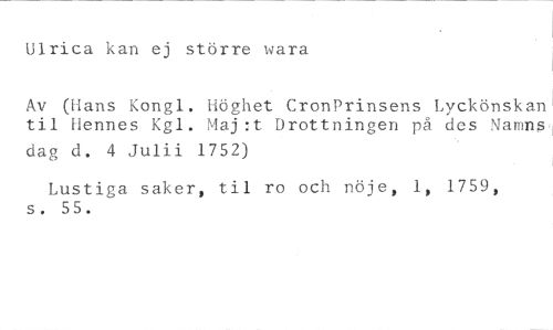 Ulrica kan ej större svara //// Av (Hans Kongi. Höghet CronPrinsens Lyckönskan til Hennes Kgl. Maj:t Drottningen på des Namng; //// dag d. 4 Julii 1752) //// Lustiga saker, til ro och nöje, 1, 1759, s. 55.