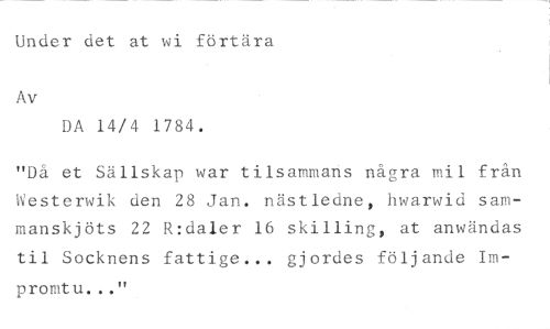 Under det at wi förtära //// Av //// DA 14/4 1784. //// "Då et Sällskap war tilsammans några mil från Westerwik den 28 Jan. nästledne, hwarwid sammanskjöts 22 R:daler 16 skilling, at anwändas til Socknens fattige... gjordes följande Impromtu..."
