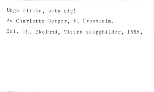 Unga flicka, akta dig! //// Av Charlotte Berger, f. Cronhielm. //// Enl. Th. Ekelund, Vittra skuggbilder, 1886,