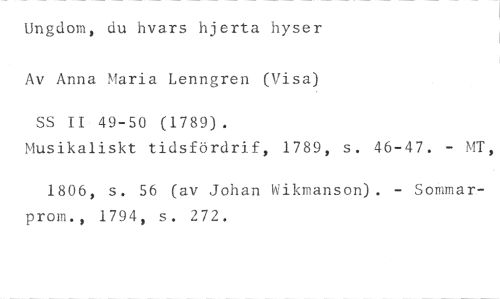 Ungdom, du hvars hjerta hyser //// Av Anna Maria Lenngren (Visa) //// SS II 49-50 (1789). //// Musikaliskt tidsfördrif, 1789, s. 46-47. - MT, //// 1806, s. 56 (av Johan Wikmanson). - Sommar.- groin. , 1794, s. 272.