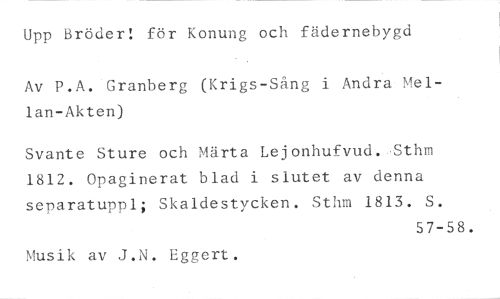 Upp Bröder: för Konung och fädernebygd //// Av P.A. Granberg (Krigs-Sång i Andra Mellan-Akten) //// Svante Sture och Märta Lejonhufvud. ,Sthm 1812. Opaginerat blad i slutet av denna senaratuppl; Skaldestycken. Sthm 1813. S. //// 57-58. //// Musik av J.N. Eggert.