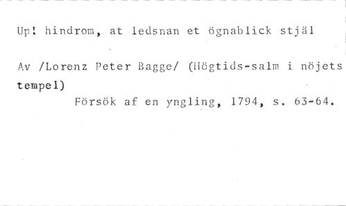 Up! hindrom, at ledsnan et bgnahlick stjäl //// Av /Lorenz Peter Bagge/ (Högtids-salm i nöjets //// tempel) //// Försök af en yngling, 1794, s. 63-64.
