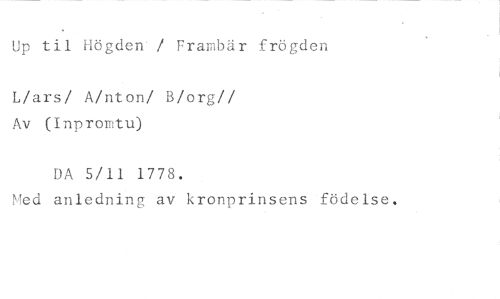 Up til Högden / Frambär frögden //// L/ars/ A/nton/ B/org// Av (Inpromtu) //// DA 5/11 1778. //// Med anledning av kronprinsens födelse.