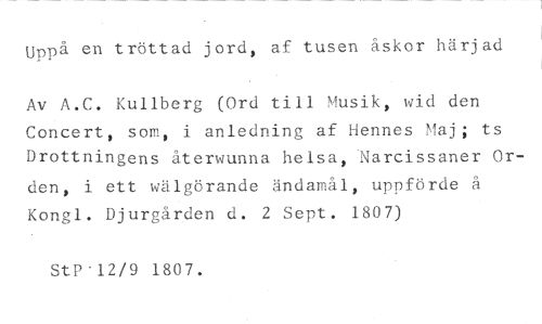 Uppå en tröttad jord, af tusen åskor härjad //// Av A.C. Kullberg (Ord till Musik, wid den Concert, som, i anledning af Hennes Maj; ts Drottningens återwunna helsa, Narcissaner Orden, i ett wälgörande ändamål, uppförde å Kongl. Djurgården d. 2 Sept. 1807) //// StP-12/9 1807.
