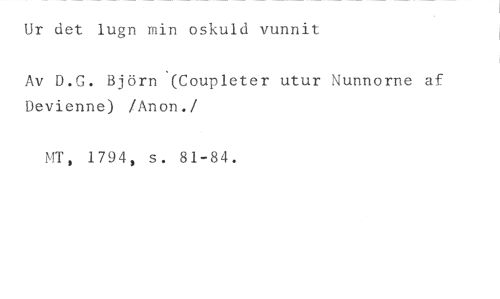 Ur det lugn min oskuld vunnit //// Av D.G. Björn '(Coupleter utur Nunnorne af Devienne) /Anon. //// /NT, 1794, s. 81-84.