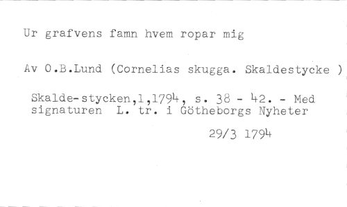 Ur grafvens famn hvem ropar mig //// Av O.B.Lund (Cornelias skugga. Skaldestycke ) //// Skalde-stycken11,17941 s. 38 - 42. - Med signaturen L. tr. i Götheborgs Nyheter //// 29/3 1794