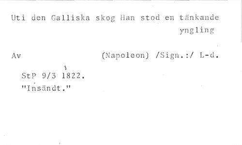 Uti den Galliska skog Han stod en tänkande //// yngling //// Av (Napoleon) /Sign.:/ L-d. //// 5 //// StP 9/3 1822. "Insändt."
