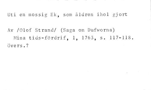 Uti en mossig Ek, som äldren ihol gjort //// Av /Olof Strand/ (Saga om Dufworna) //// Mina tids-fördrif, 1, 1763, s. 117-118. övers.?