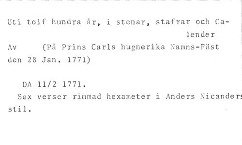Uti tolf hundra år, i stenar, stafrar och Ca- //// lender //// Av (På Prins Carls hugnerika Namns-Fäst //// den 28 Jan. 1771) //// DA 11/2 1771. //// Sex verser rimmad hexameter i Anders Nicander: stil.