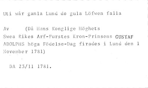Uti wår gamla Lund de gula Löfwen falla //// Av (Då Hans Konglige Höghets //// Swea Rikes Atf-Furstes Kron-Prinsens GUSTAF ADOLPHS höga Födelse-Dag firades i Lund den 1 November 1781) //// DA 23/11 1781.