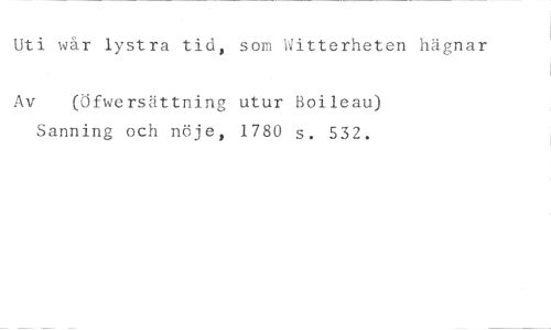 Uti wår lystra tid, som Witterheten hägnar //// Av (Öfwersättning utur Boileau) //// Sanning och nöje, 1780 s. 532.