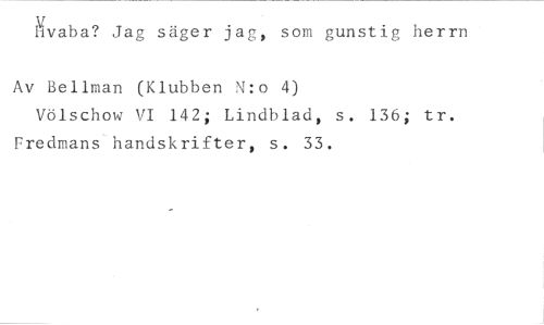 Yvaba? Jag säger jag, som gunstig herrn //// Av Bellman (Klubben N:o 4) //// Völschow VI 142; Lindblad, s. 136; tr. Fredmans handskrifter, s. 33.