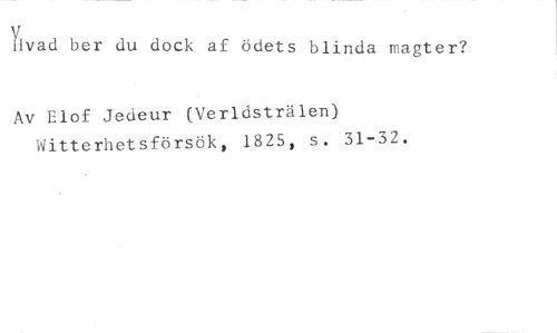 V //// Hvad ber du dock af ödets blinda magter? //// Av Elof Jedeur (Verldsträlen) Vitterhetsförsök, 1825, s. 31-32.