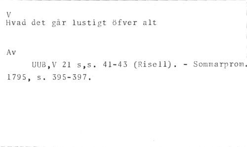 v //// Hvad det går lustigt öfver alt //// Av //// 11113,V 21 s,s. 41-43 (Risell). - Sommarprom. 1795, s. 395-397.
