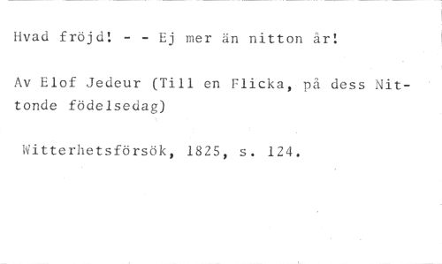 Hvad fröjd! - - Ej mer än nitton år! //// Av Elof Jedeur (Till en Flicka, pz dess Nittonde födelsedag) //// Witterhetsförsök, 1825, s. 124.